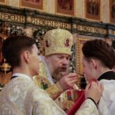 Во время пения антифонов митрополит Леонтий совершил хиротесию (поставление во чтеца) воспитанников 4 курса пастырского факультета семинарии Ярослава Мамедова, Тихона Медведева, Дмитрия Родионова и Павла Чорнобая.