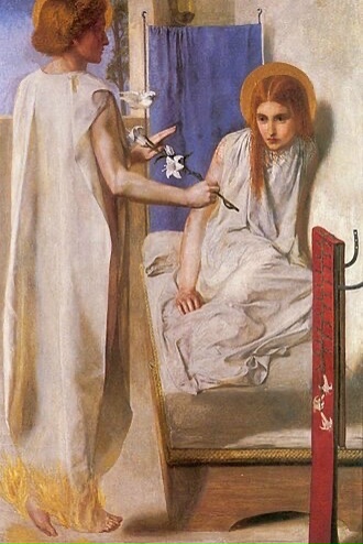 Иллюстрацией к празднику Благовещения может служить картина Данте Габриэля Росетти с одноименным названием. В центре композиции мы видим две фигуры: слева — юноша с рыжими волосами в легком белом одеянии, архангел Гавриил. Его ноги как будто не касаются пола. В руке у него белая лилия, которую он протягивает девушке. Справа — юная девушка с рыжими волосами, тоже одетая в белое. Над ее головой — нимб, указывающий на святость. Взгляд девушки направлен на лилию, поза выражает удивление и трепет.