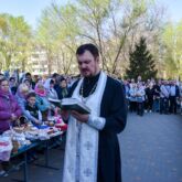 Настоятель храма во имя прп. Сергия Радонежского протоиерей Роман Вылуск совершил традиционное освящение пасхальных куличей, яиц и брашна