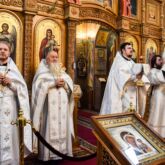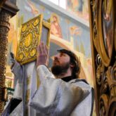 Затем после отпуста литургии на центре храма перед иконой было совершено славление празднику.