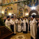 Богослужение началось чтением великого повечерия. Трижды открывались Царские врата — во время пении хором торжественных, главных песнопений праздника — ветхозаветного библейского текста святого пророка Исаии: «С нами Бог, разумейте языцы и покаряйтеся, яко с нами Бог!», а также тропаря «Рождество Твое, Христе Боже наш…» и кондака «Дева днесь Пресущественного раждает…».