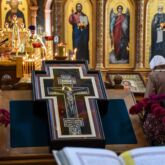 По отпусте литургии, на центре храма было совершено поклонение Честному и Животворящему Кресту Господню.