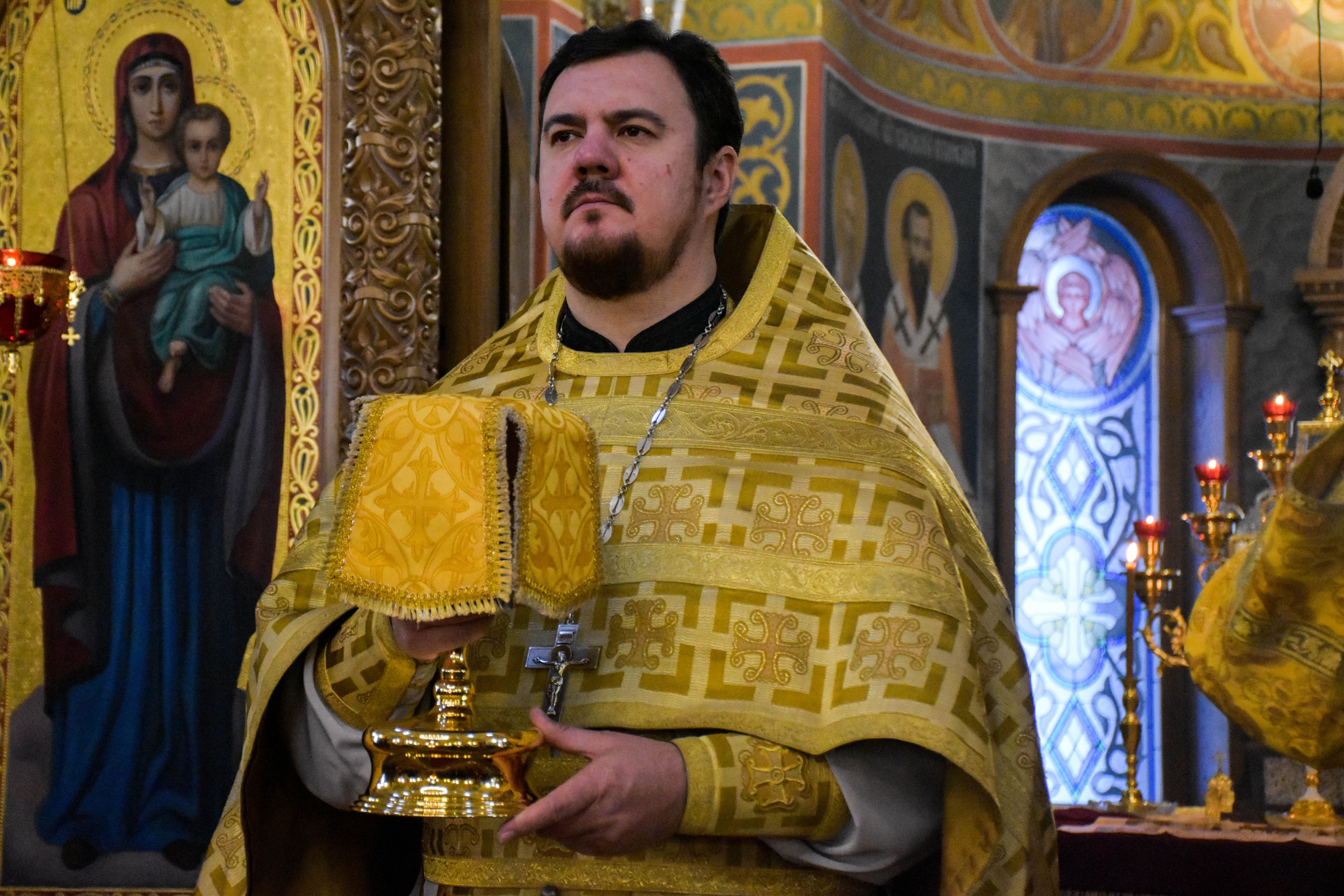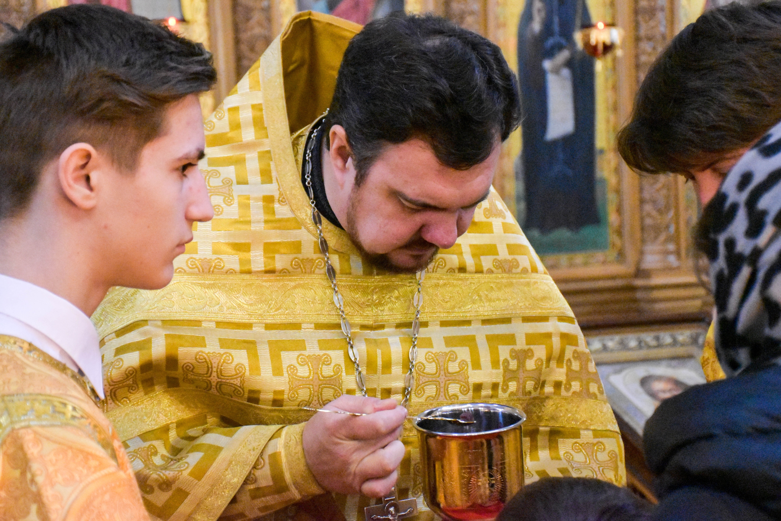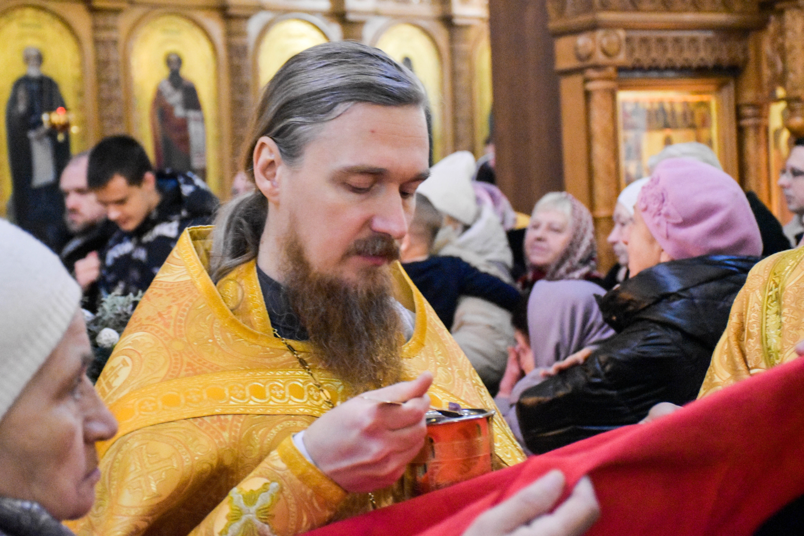 По отпусте литургии, отец Роман обратился к прихожанам со словами проповеди. Настоятель рассказал о воскресном евангльском зачале, которое читалось за литургией.