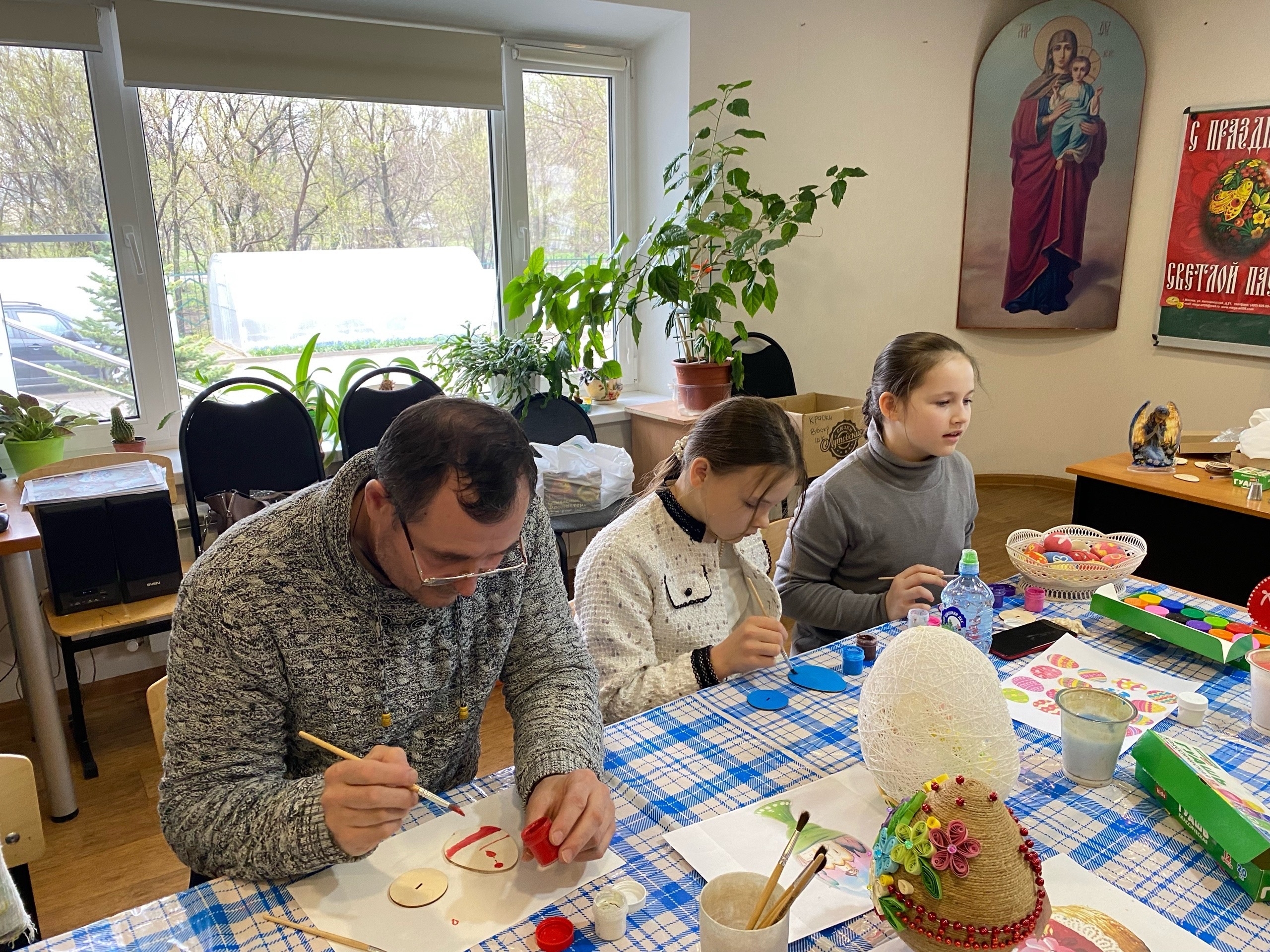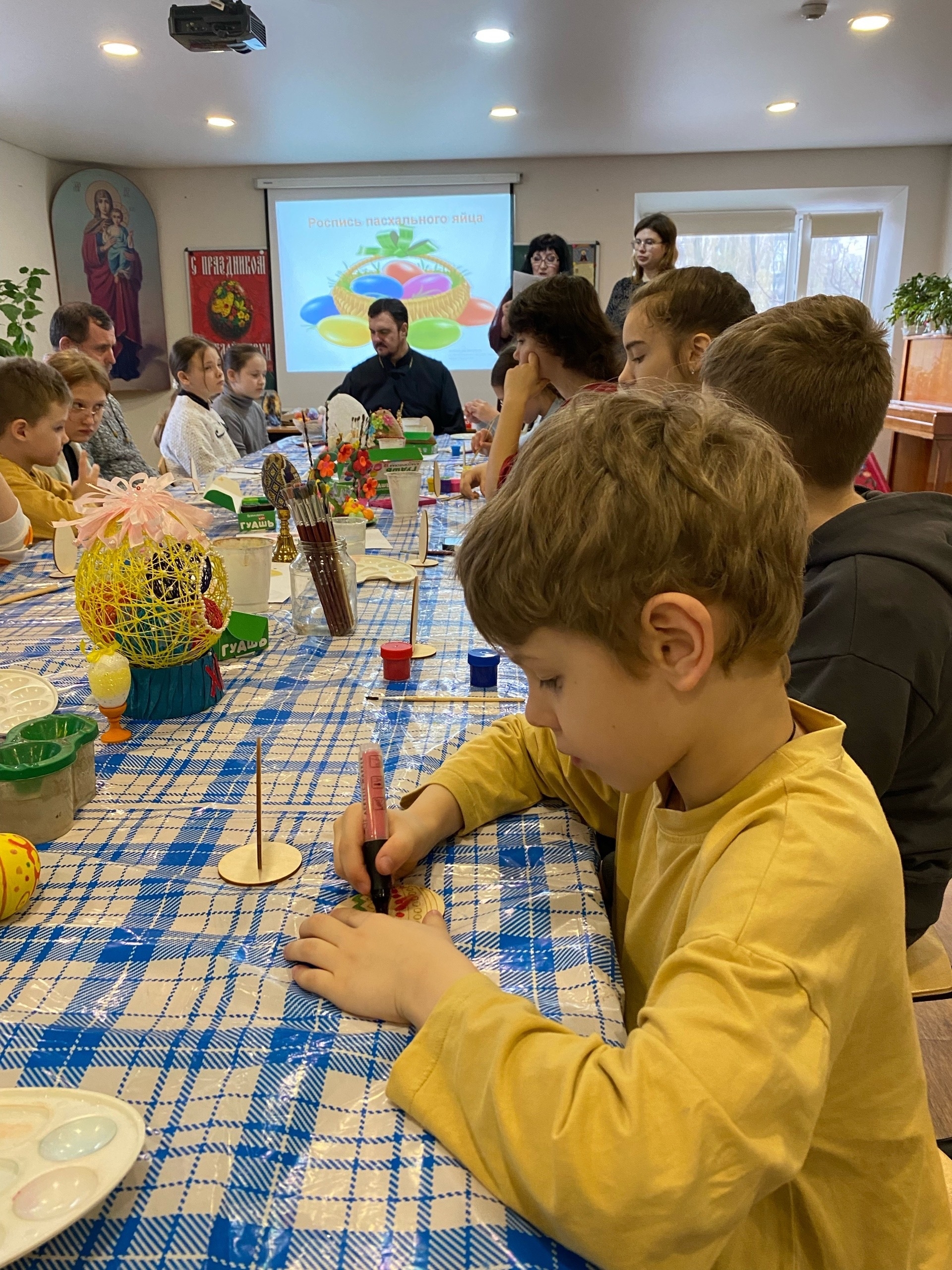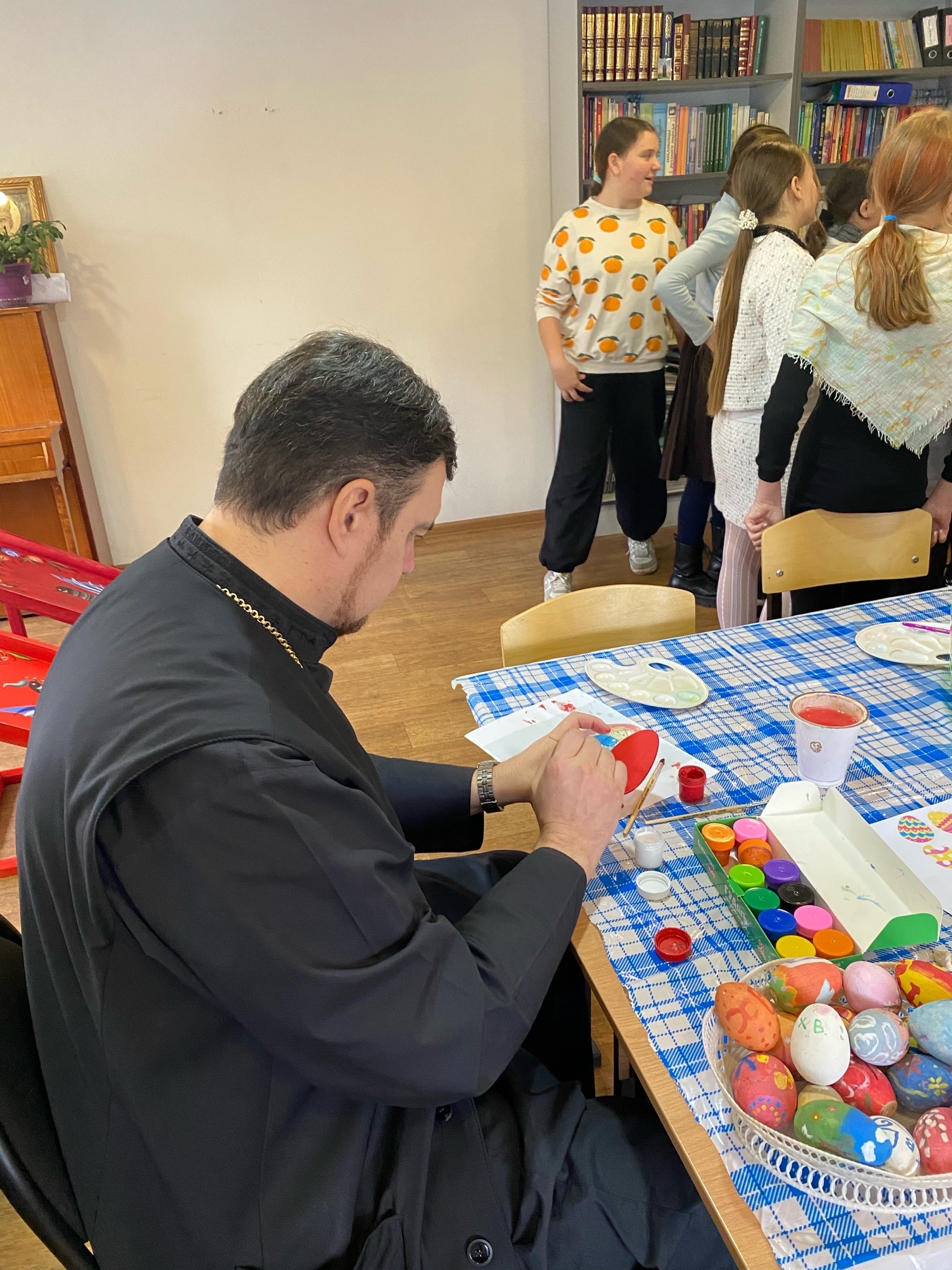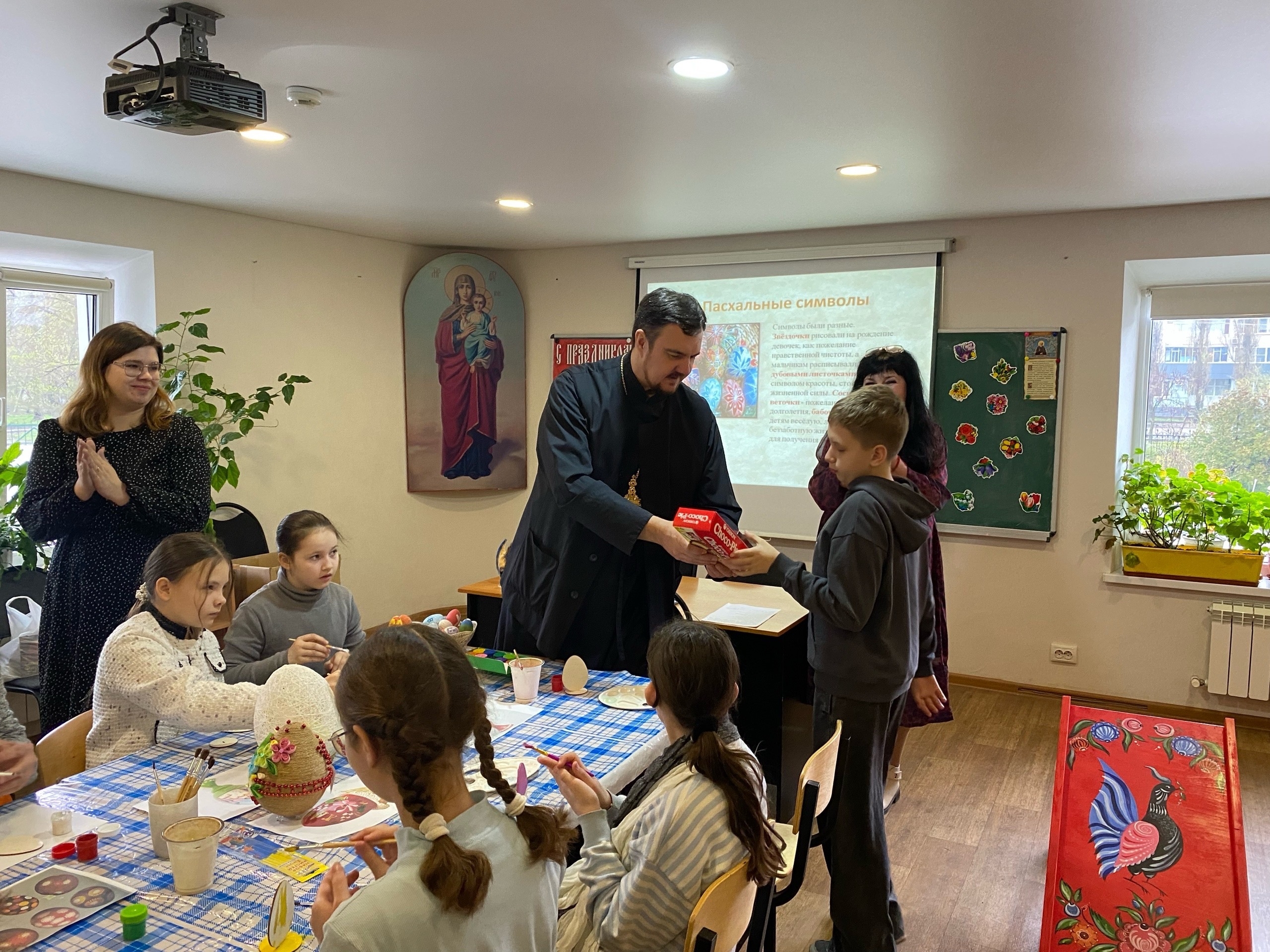 19 апреля в Неделю апостола Фомы (Антипасхи) педагоги Воскресной школы храма во имя преподобного Сергия Радонежского провели для своих воспитанников серию пасхальных мастер-классов, в которых принял участие настоятель протоиерей Роман Вылуск.