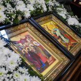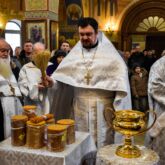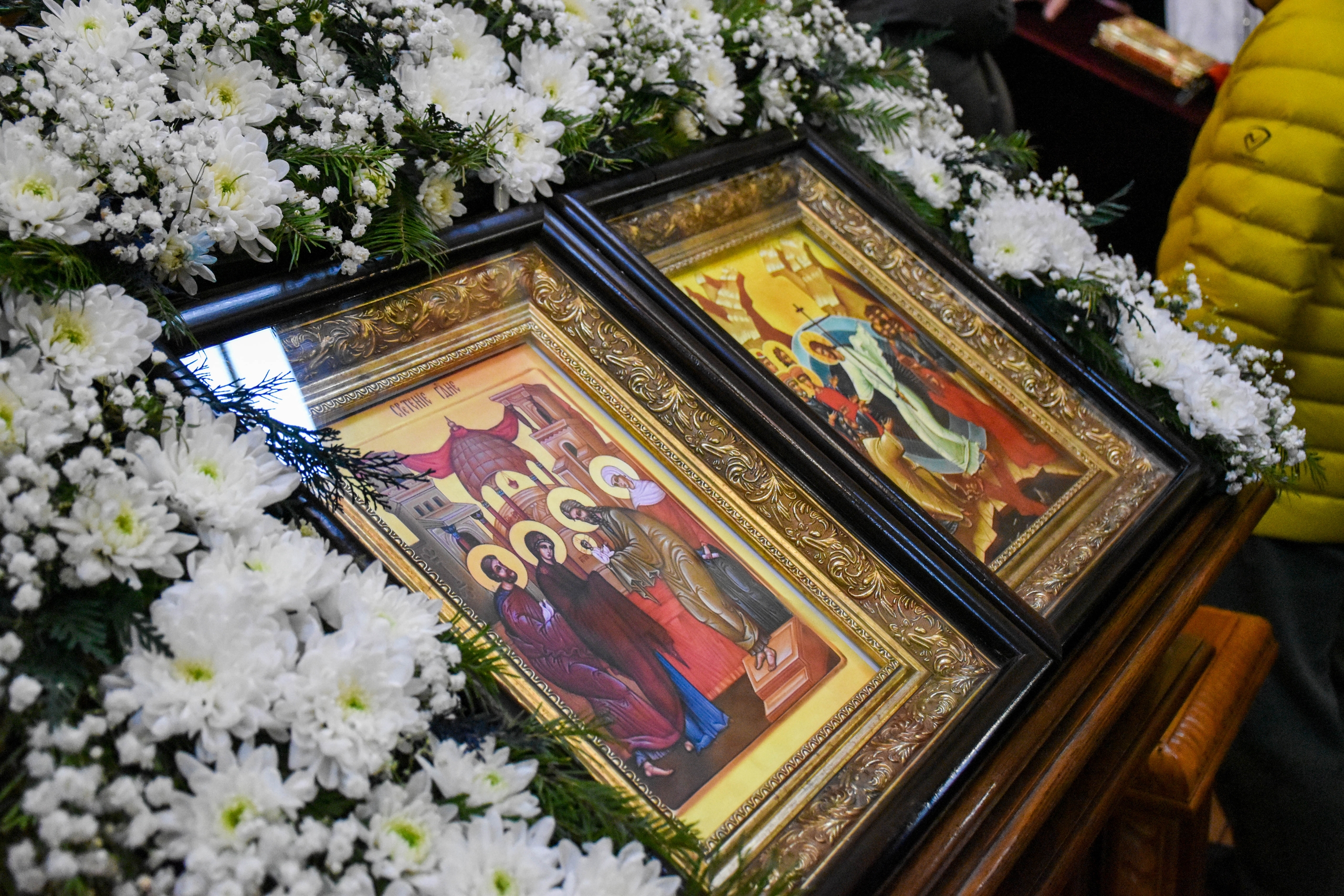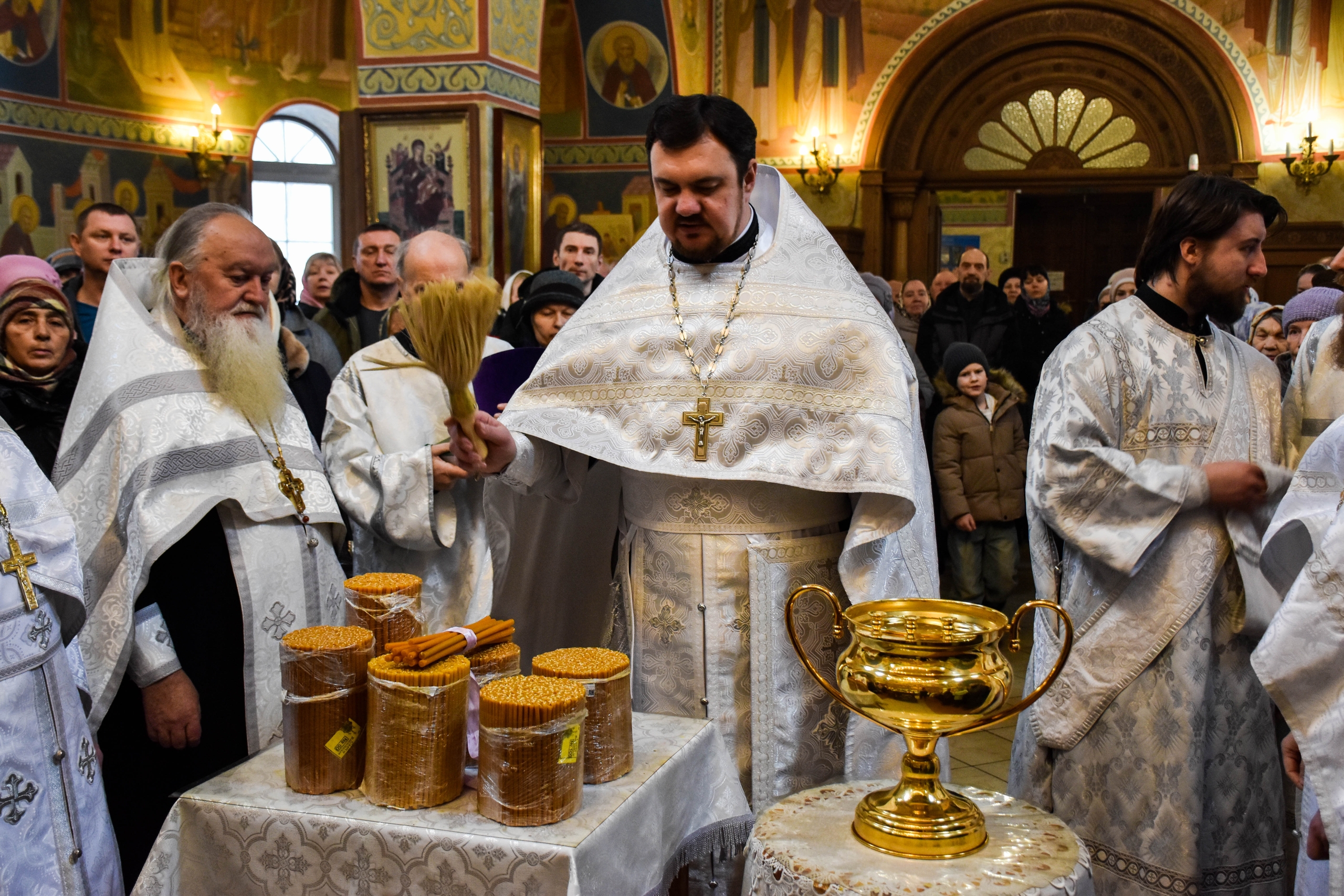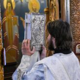 Затем после отпуста литургии на центре храма перед иконой было совершено славление празднику, а также по традиции были освящены свечи.