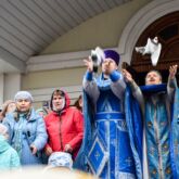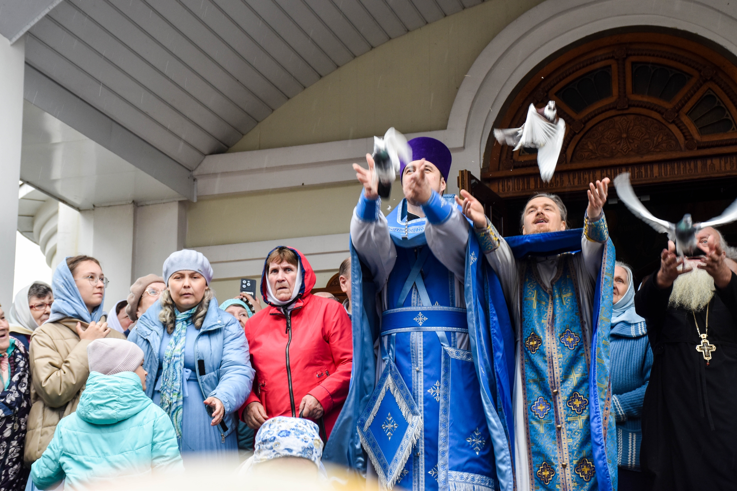 Затем по традиции, после богослужения в праздник Благовещения, настоятель храма вместе с духовенством и прихожанами выпустил в небо голубей в знак того, что Господь, пришедший в мир, так же освобождает душу каждого из нас от греха и порока.