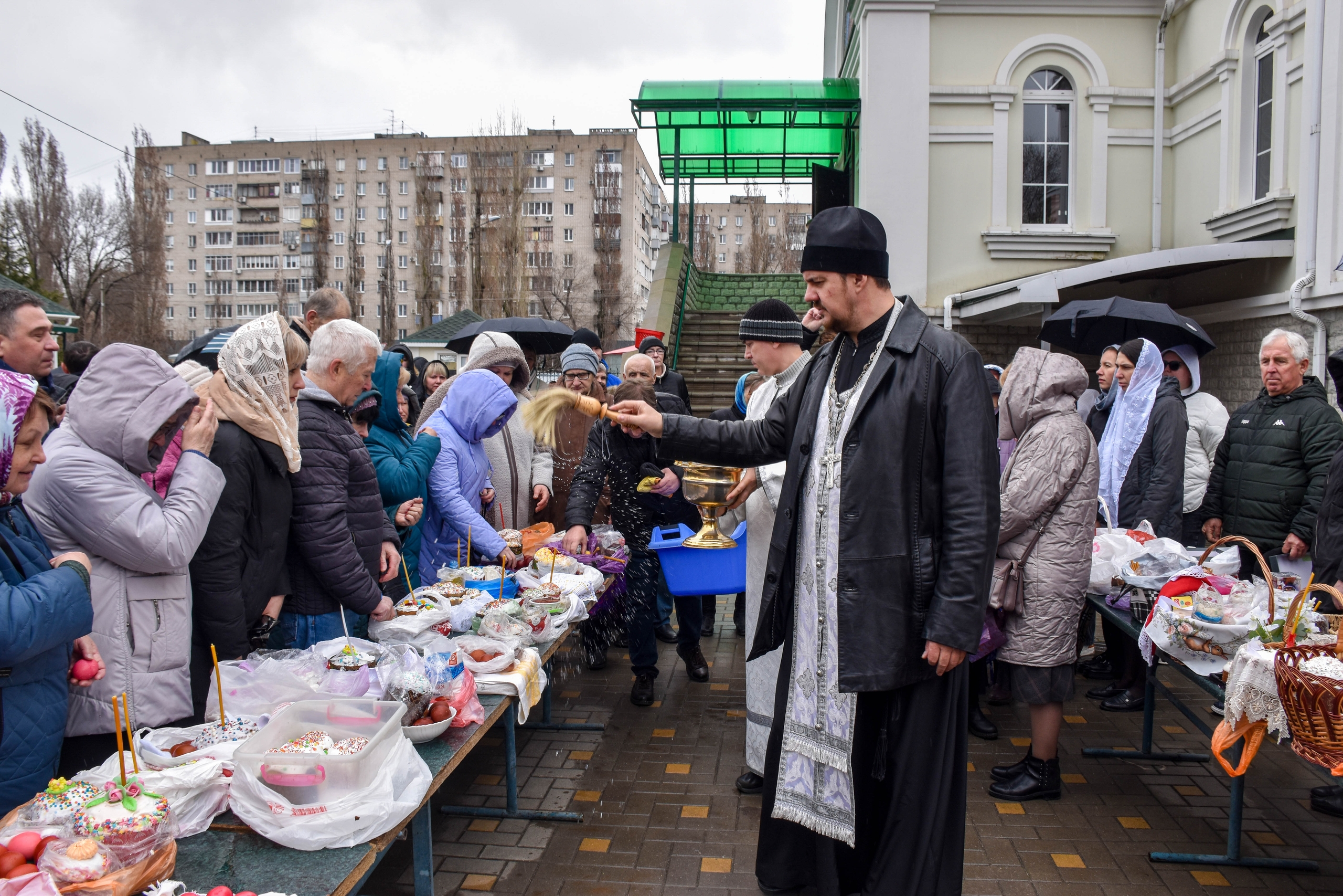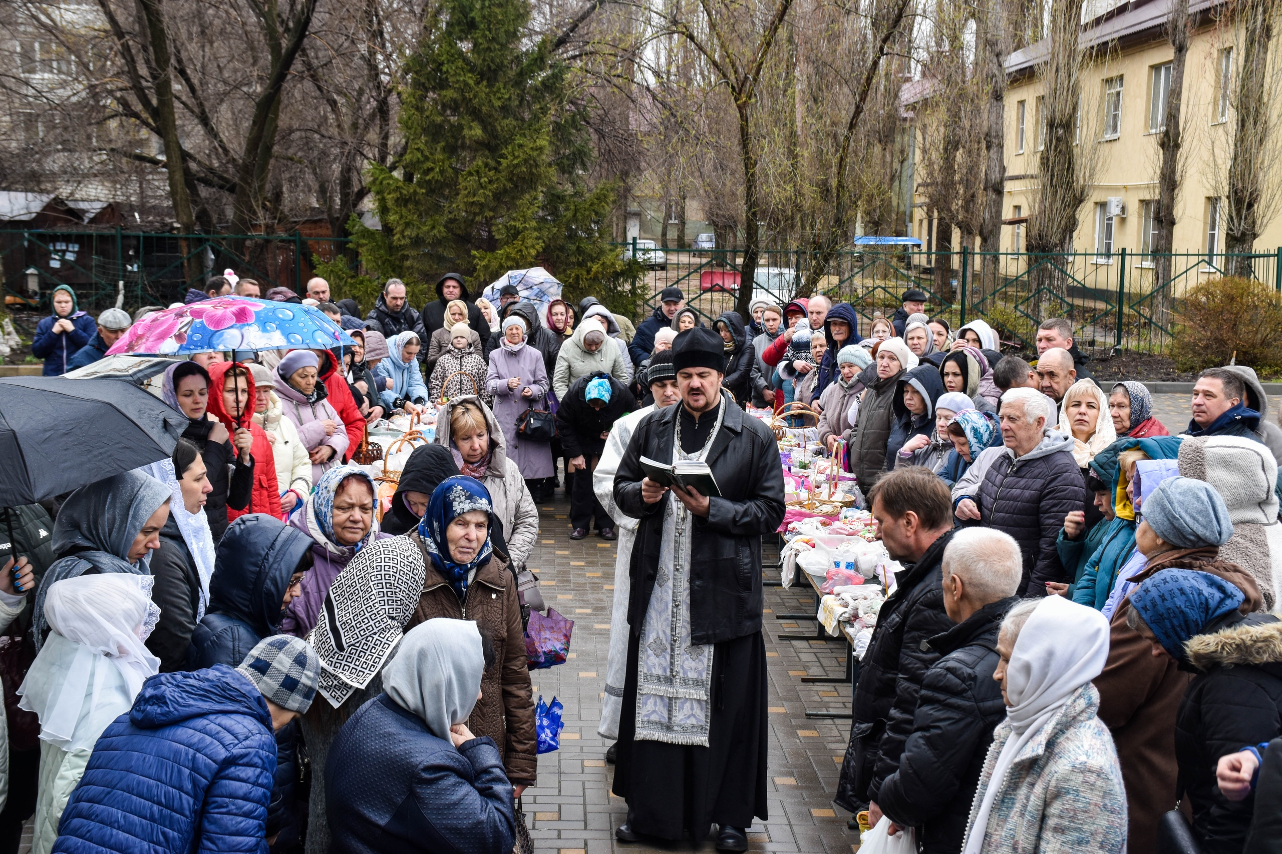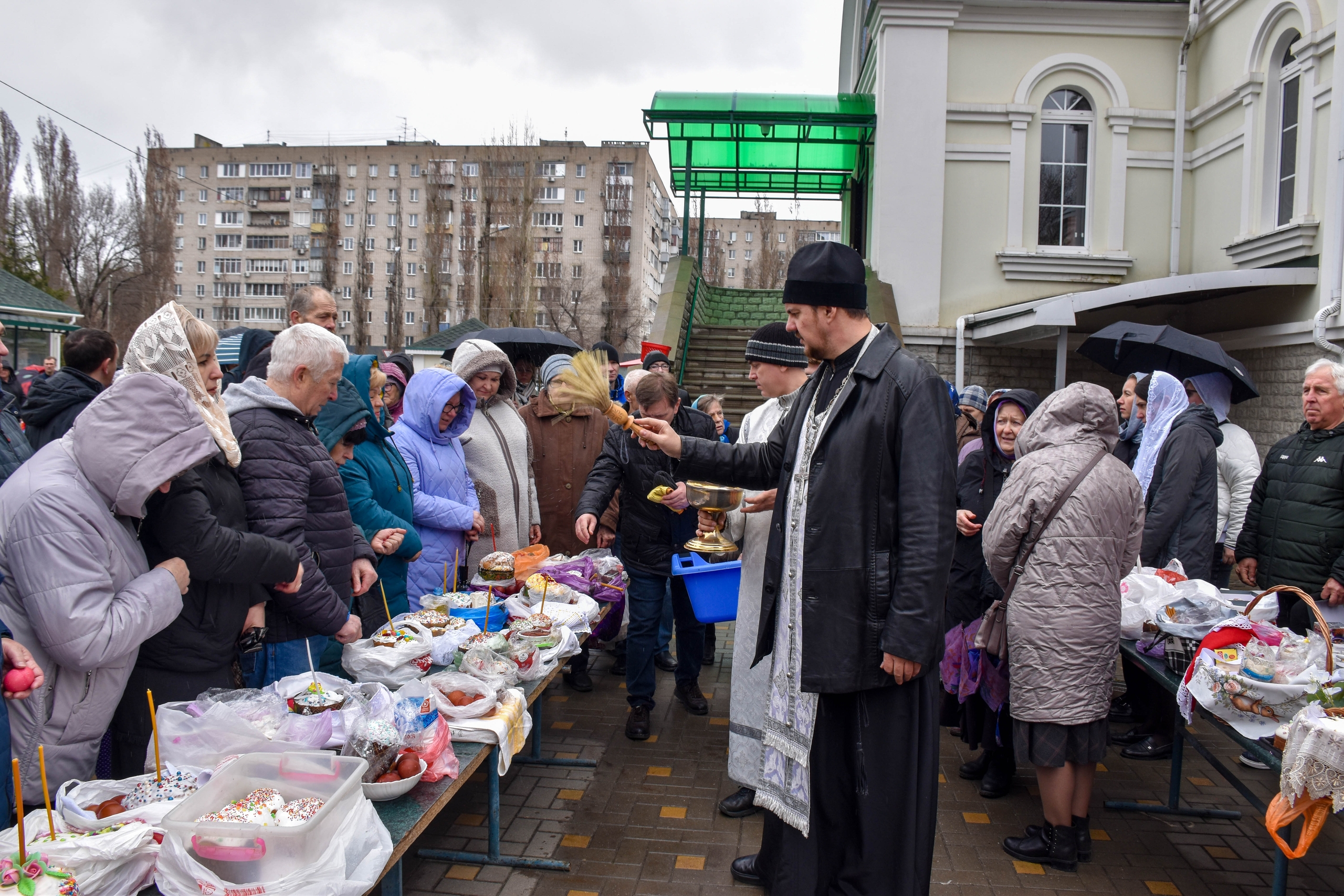 В Великую Субботу, по окончании литургии настоятель храма во имя преподобного Сергия Радонежского протоиерей Роман Вылуск совершил традиционное освящение пасхальных куличей, яиц и брашна